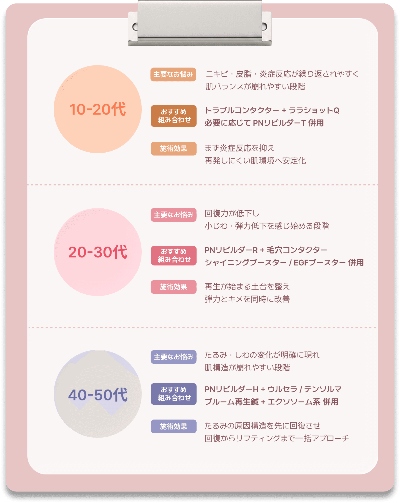 肌状態に応じて、再生・安定化・弾力など最も必要な回復ポイントから正確に設計します。